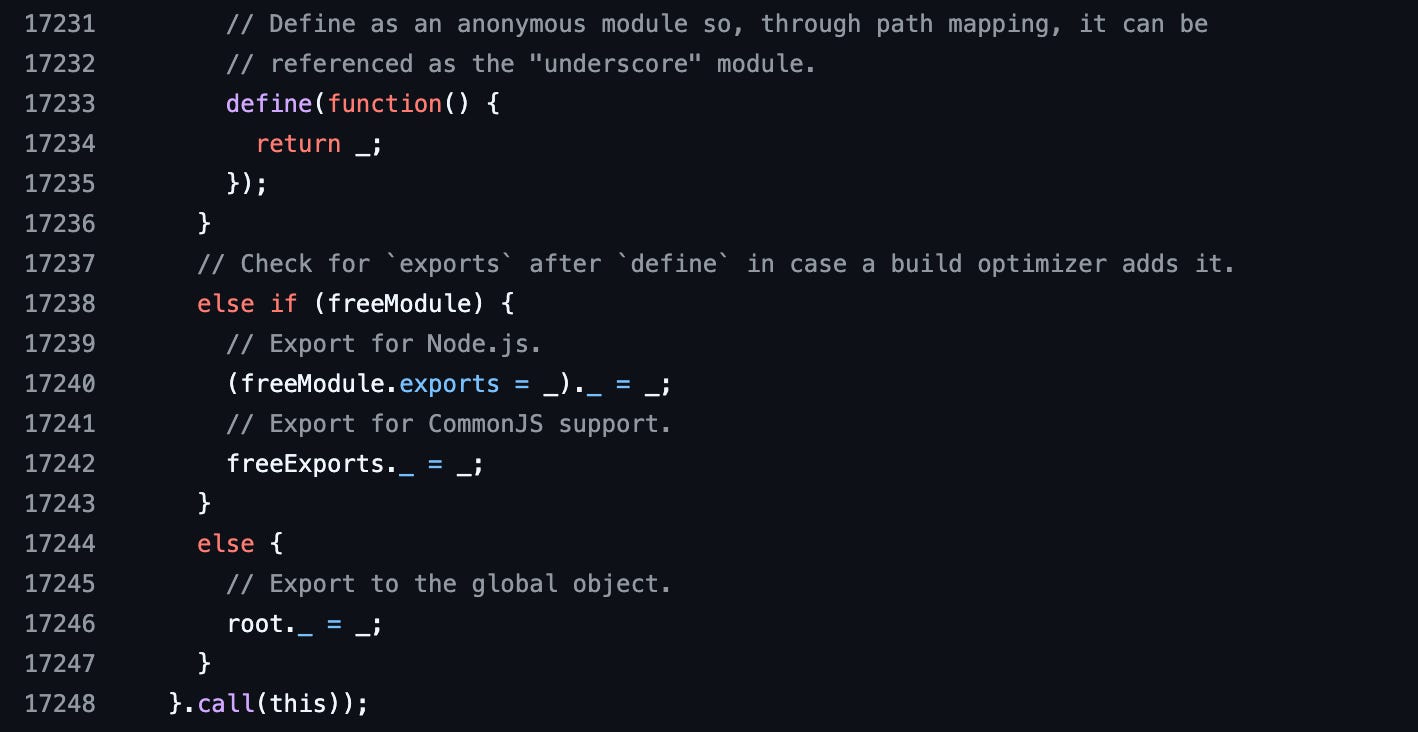 They don’t publish this enormous file, though. It will stretch out the network cable it travels through. The complexity in Lodash is in its build process. They have a CLI that mangles the file into different formats and builds.