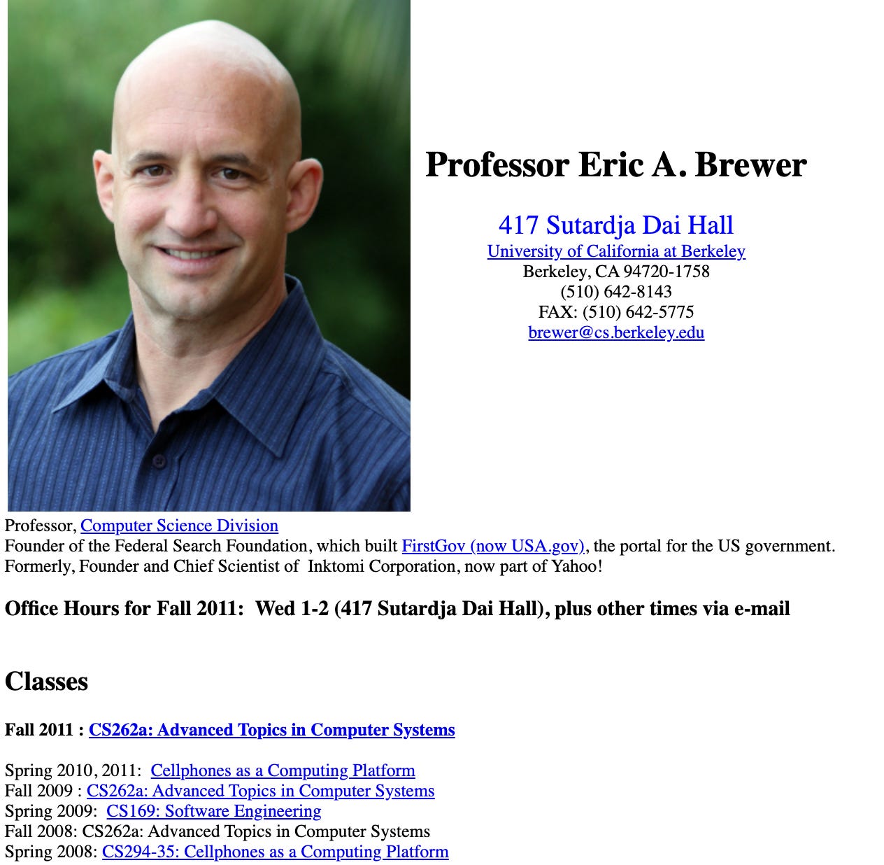 Brewer’s personal webpage looks just like you’d expect from someone with an enormous impact on the industry. When you see unstyled HTML, you know the person is for real. I’m not that good of an engineer, so I still need to write CSS for my blog.